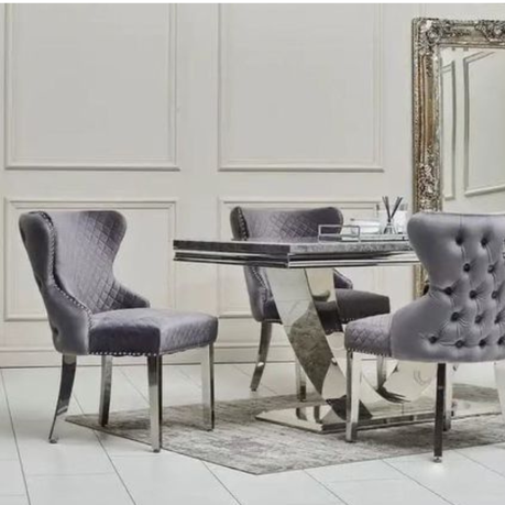 The chair's design combines straight lines with soft, padded curves, creating a contemporary yet comfortable seating option. The thick-filled seat cushion offers exceptional support and is upholstered in luxurious silk-grey velvet fabric. Subtle chrome button detailing along the trim and back of the chair, paired with chrome legs, adds a touch of modern elegance.